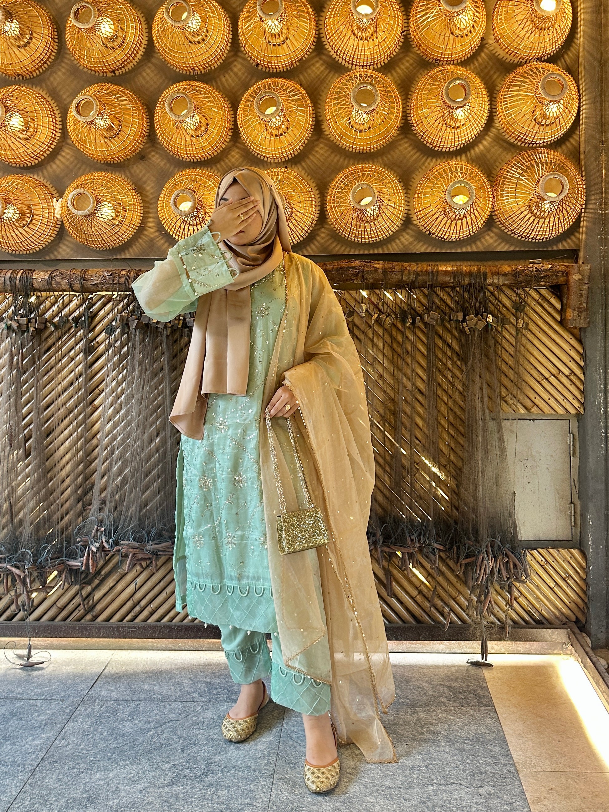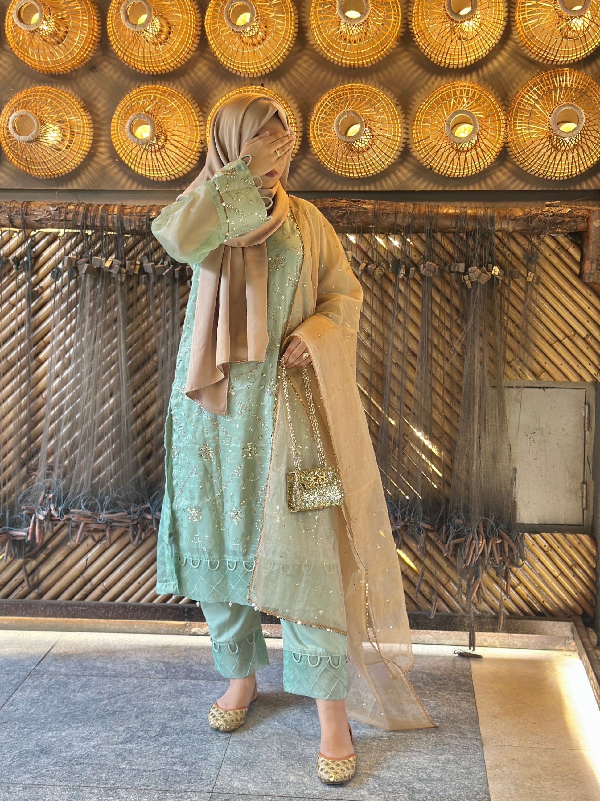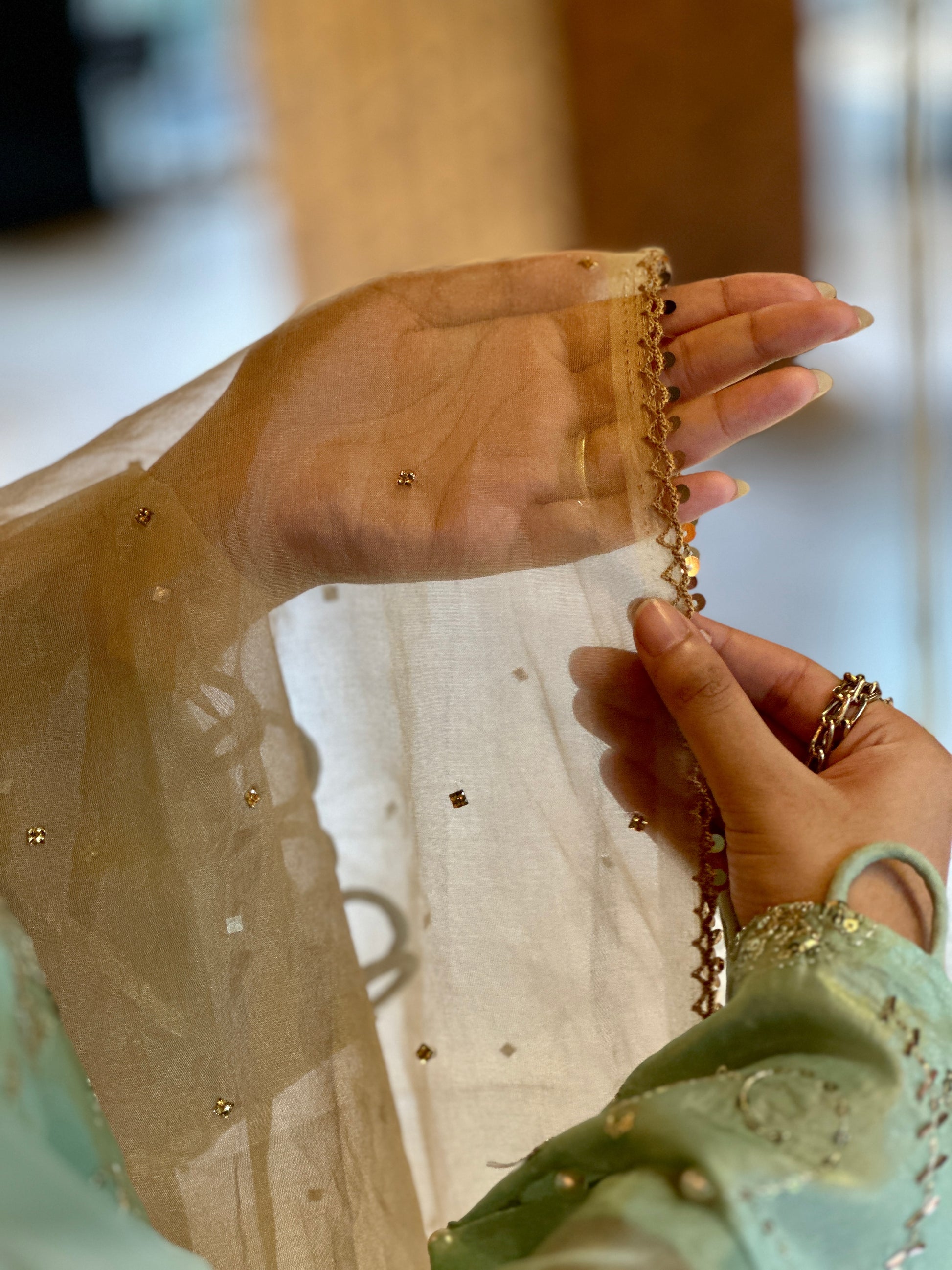 Limited edition : Jimmy Choo fabric kameez with silk cotton lining, detailed salwar, and lace work on the organza dupatta, available in pastel mint and teal green.