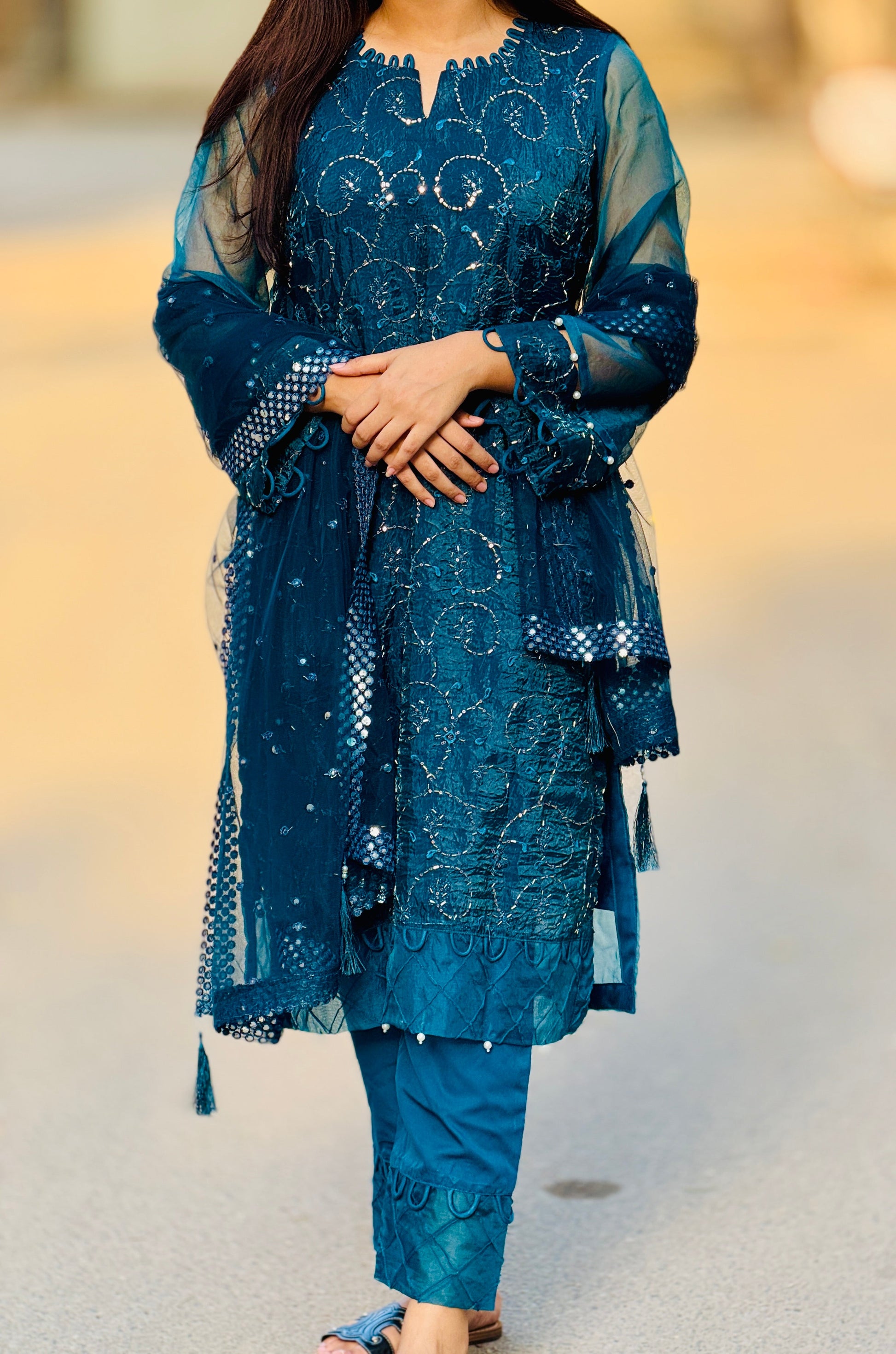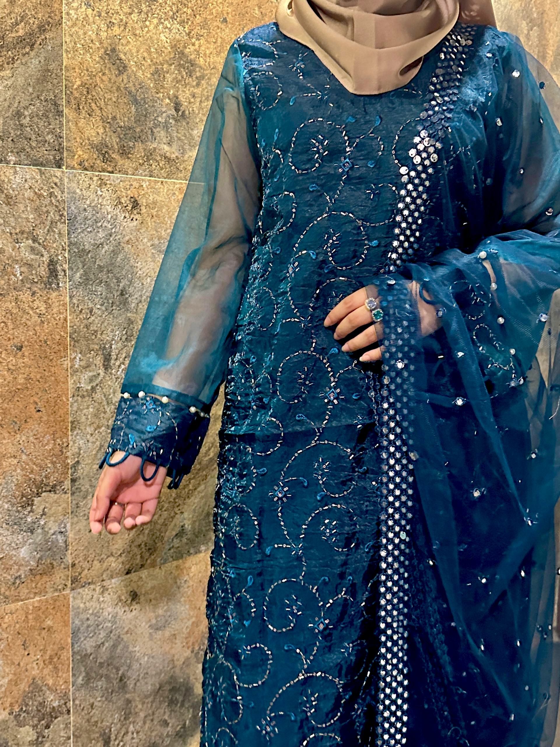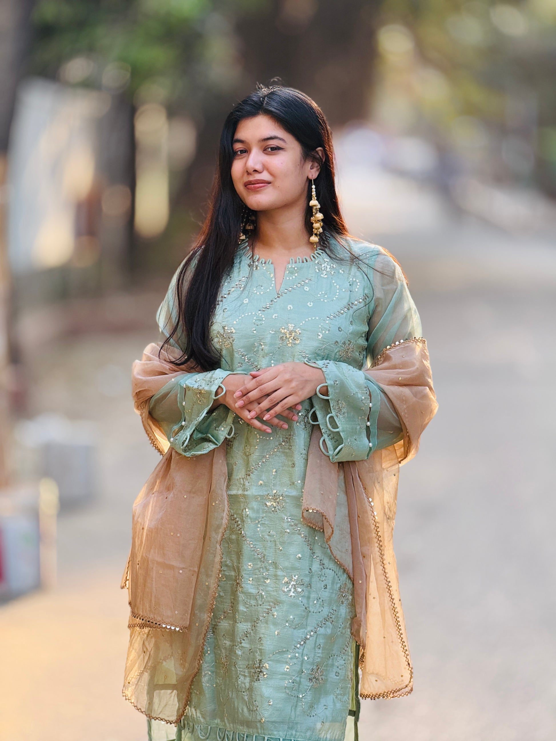 Limited edition : Jimmy Choo fabric kameez with silk cotton lining, detailed salwar, and lace work on the organza dupatta, available in pastel mint and teal green.