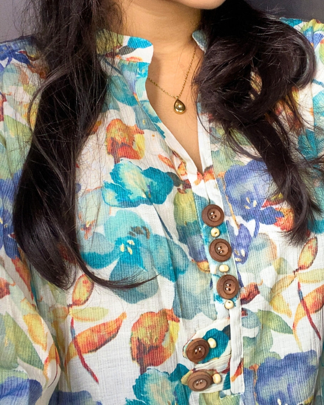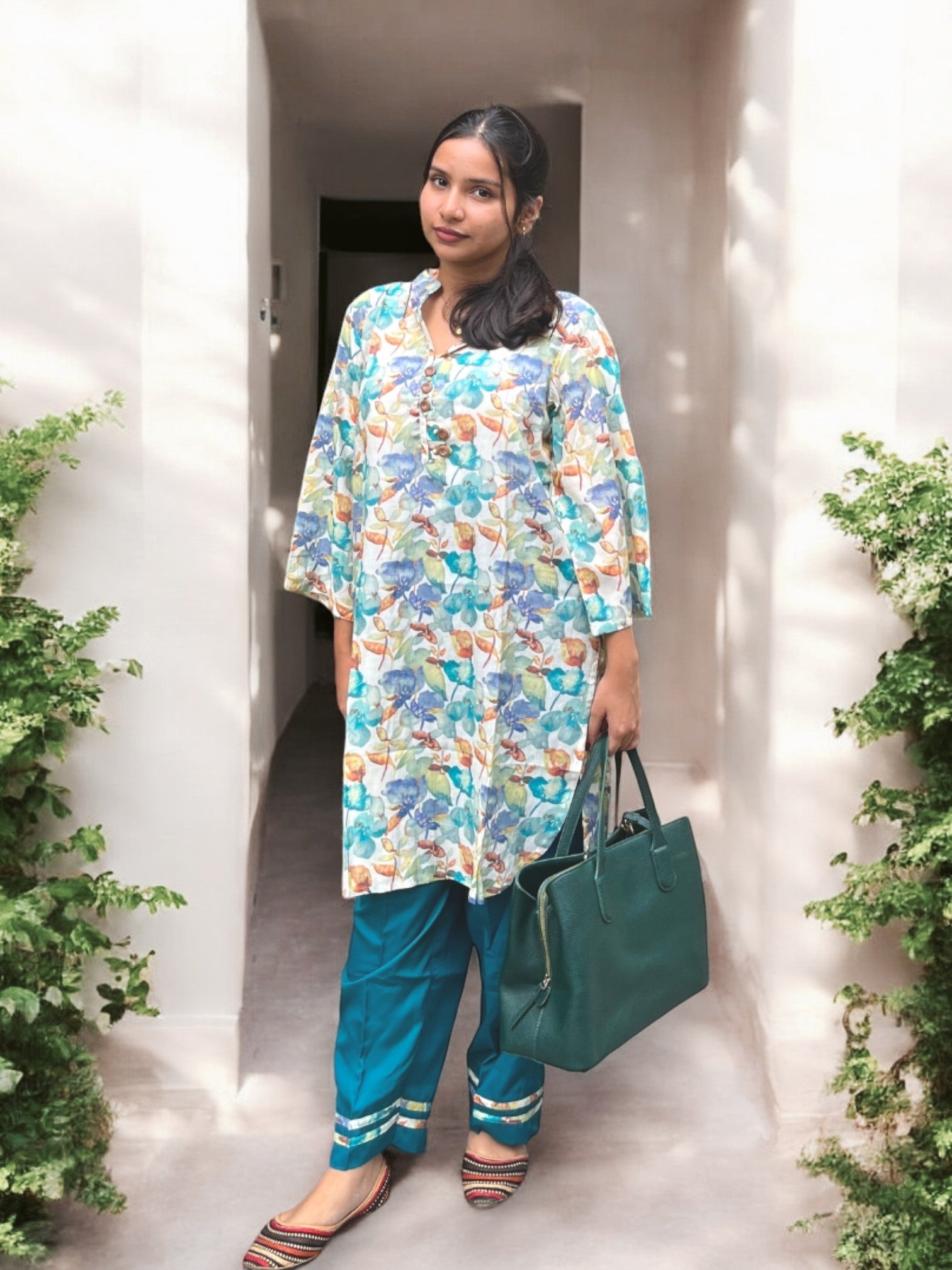 Featuring a breezy loose fit with delicate leafy prints, paired with luxurious silk cotton salwar for a touch of sophistication and comfort.