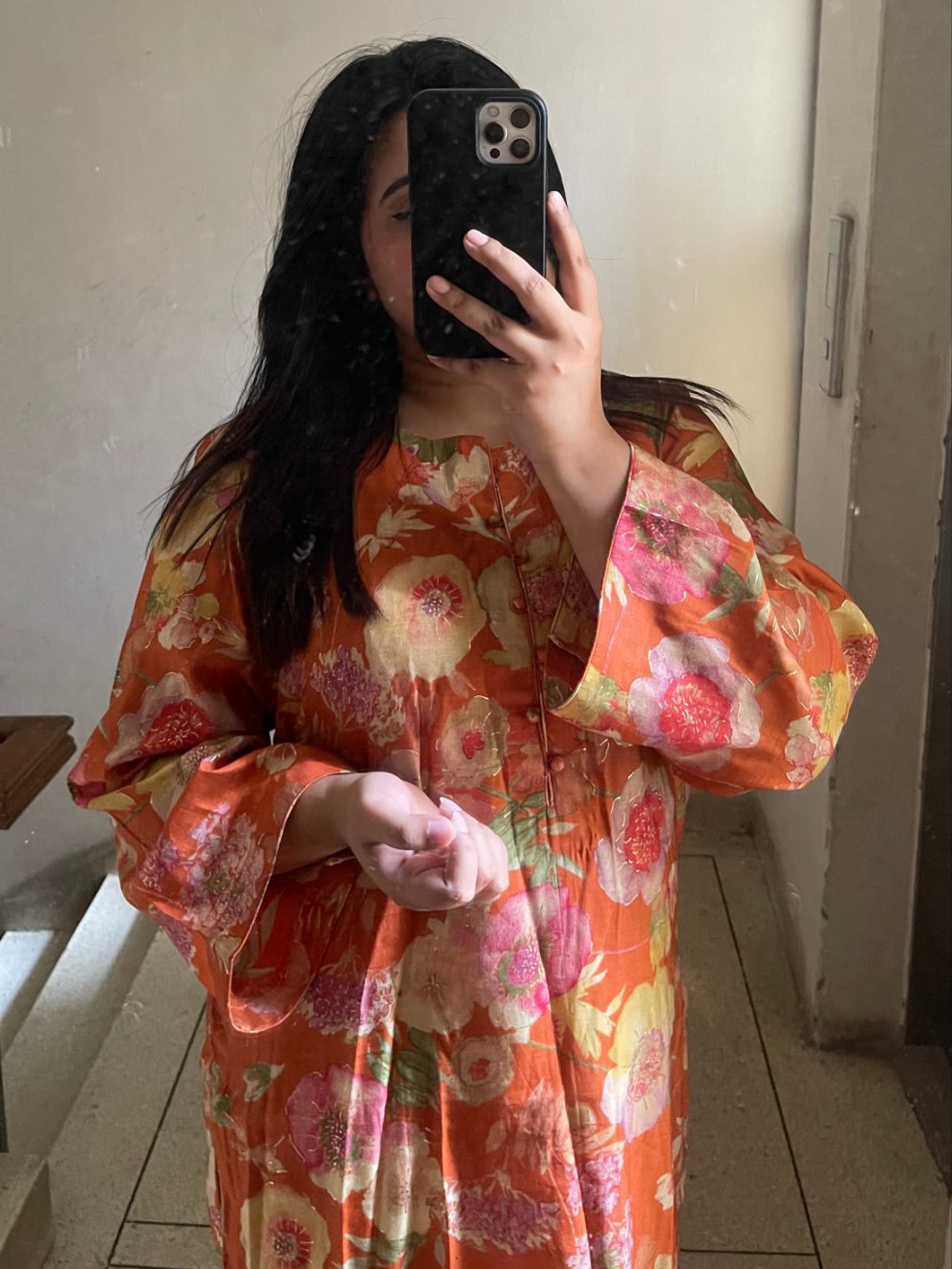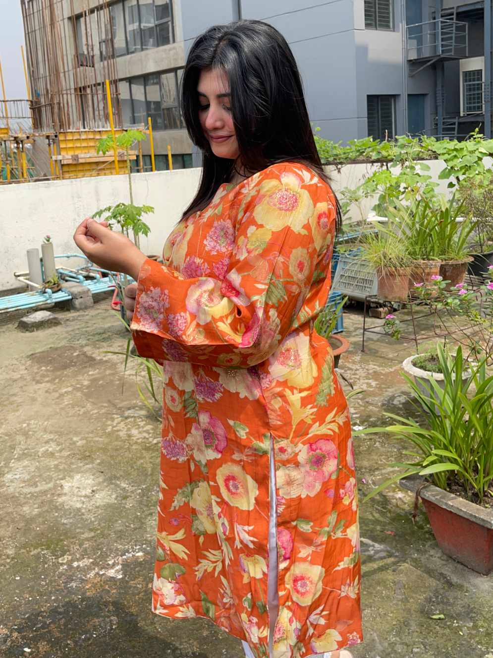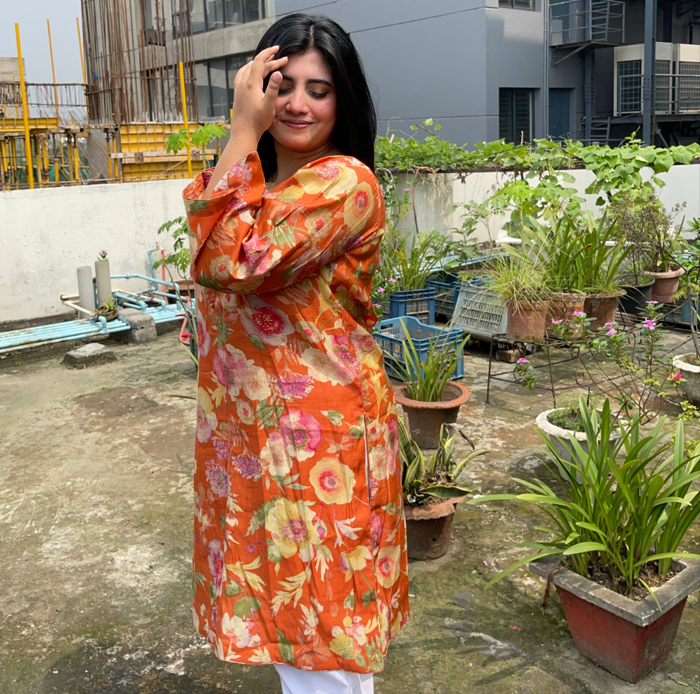 Single kurti featuring vibrant orange hue with flowery prints and button detailing on neckline