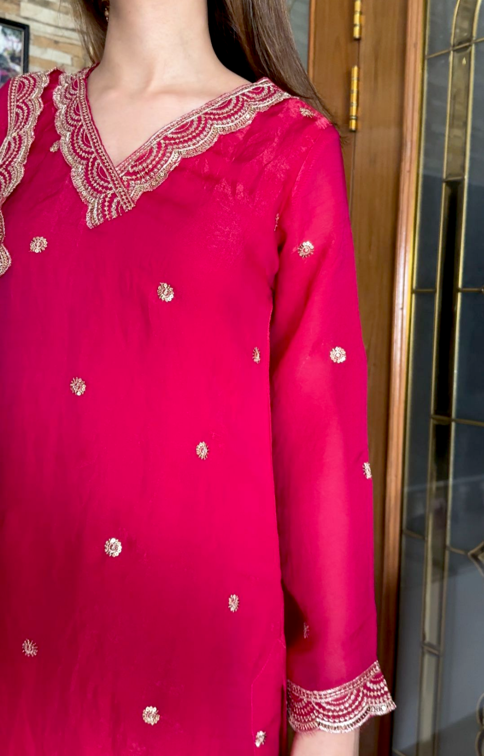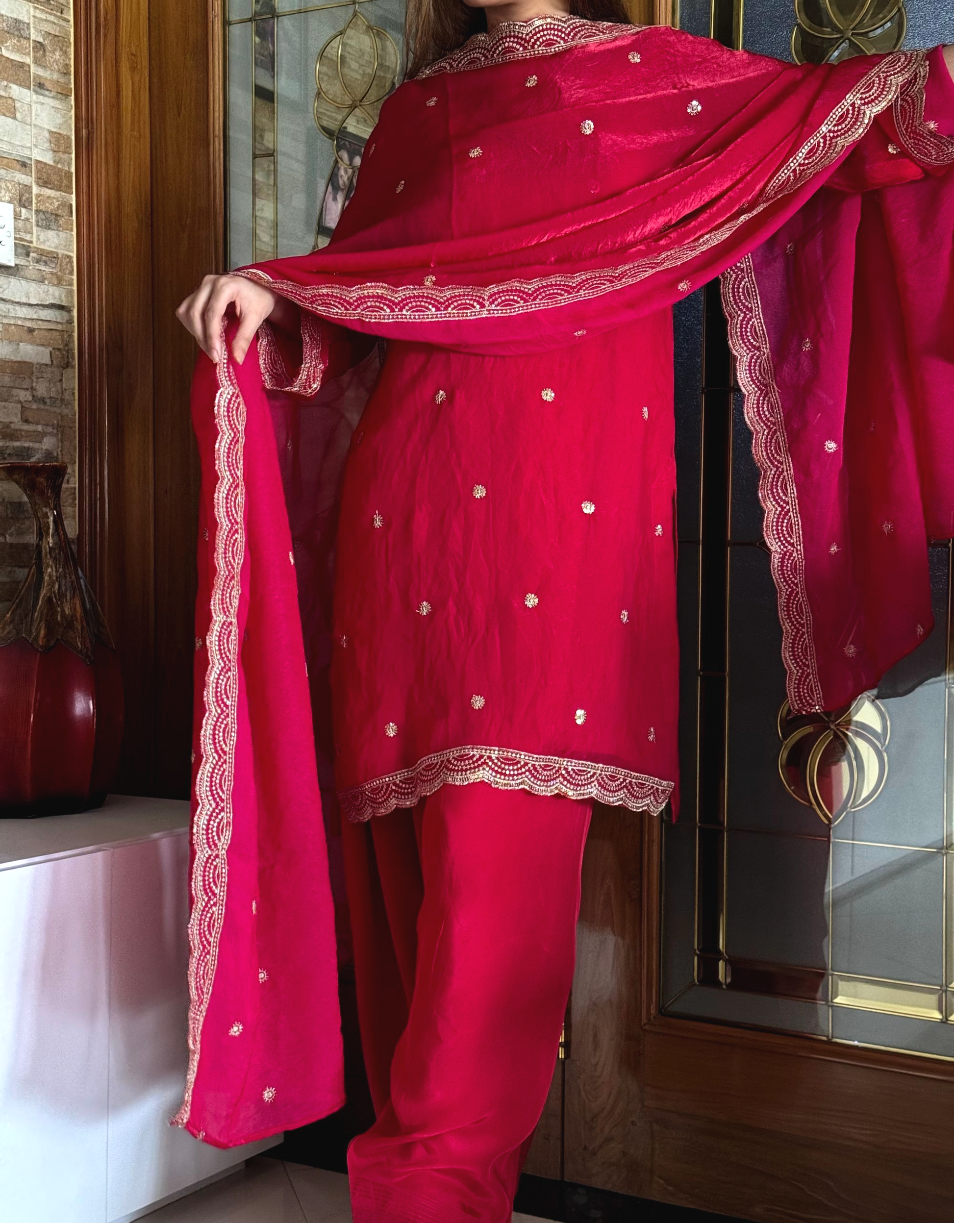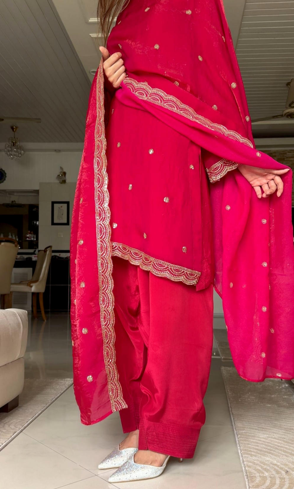 A flowy georgette party wear with a soft silk inner, detailed embroidery on the neck and sleeves, paired with dupatta and a premium silk Farsi salwar