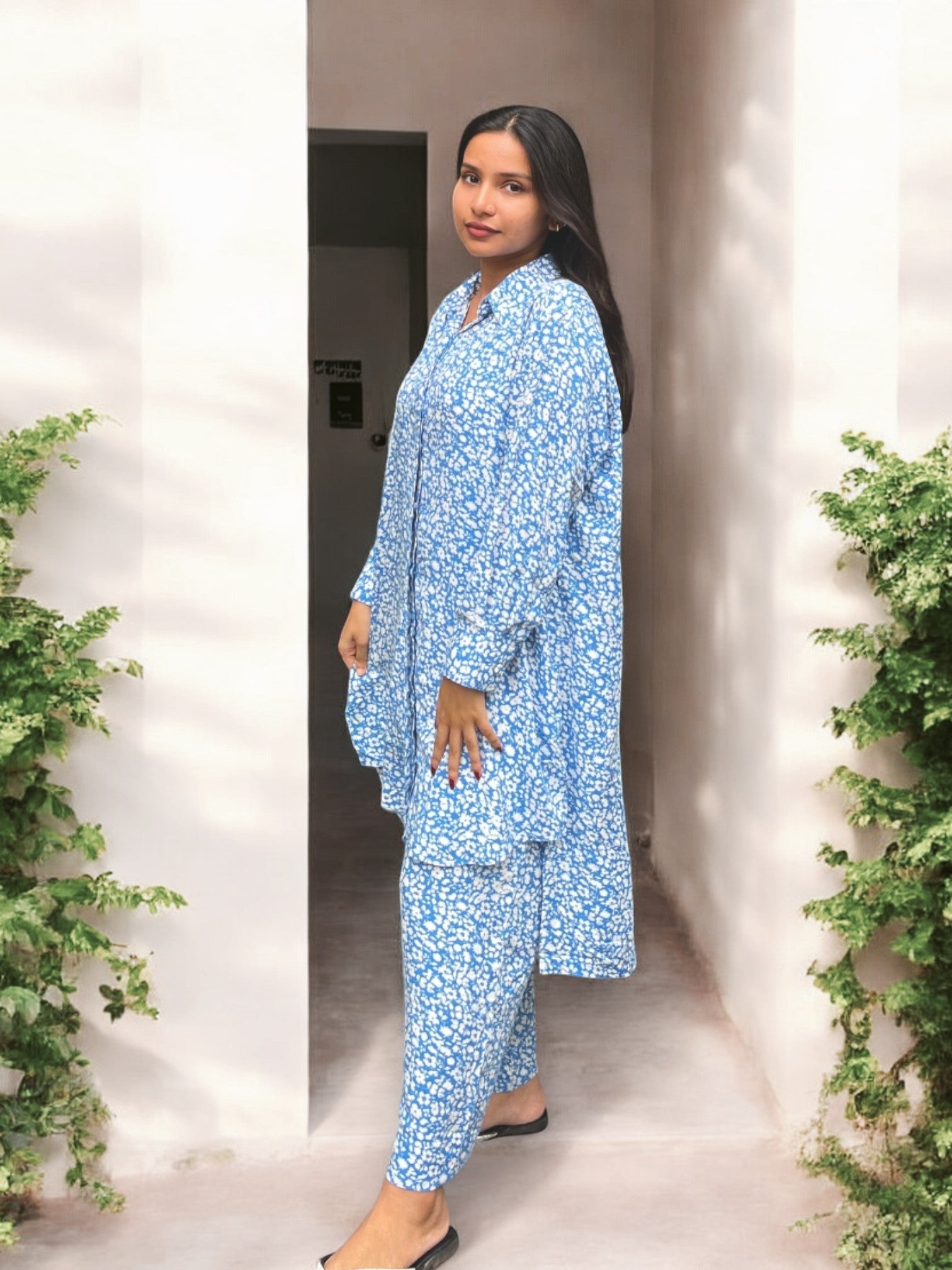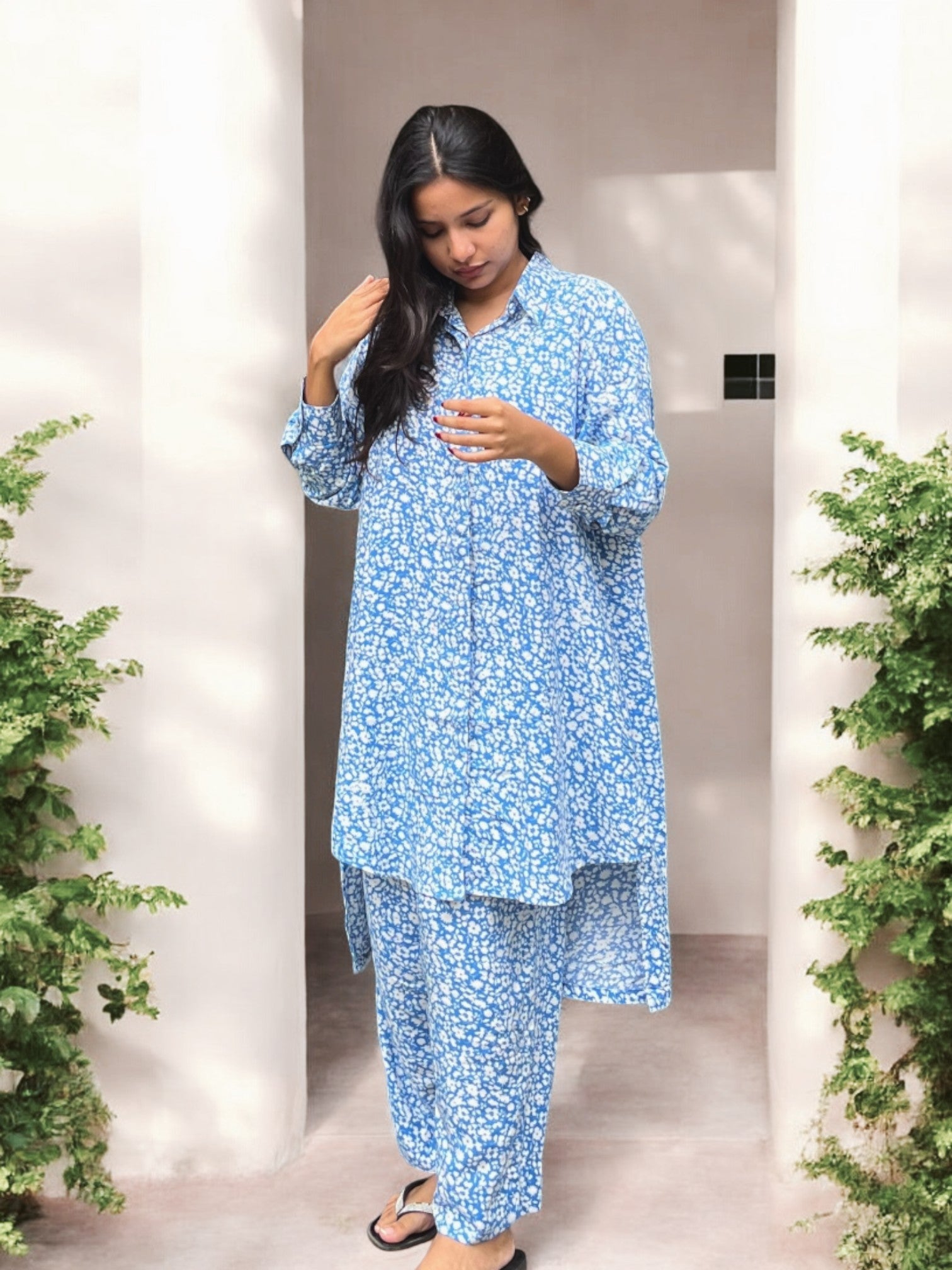 Style your summer in a loose-fit breathable blue and white linen shirt and pant co-ord set.