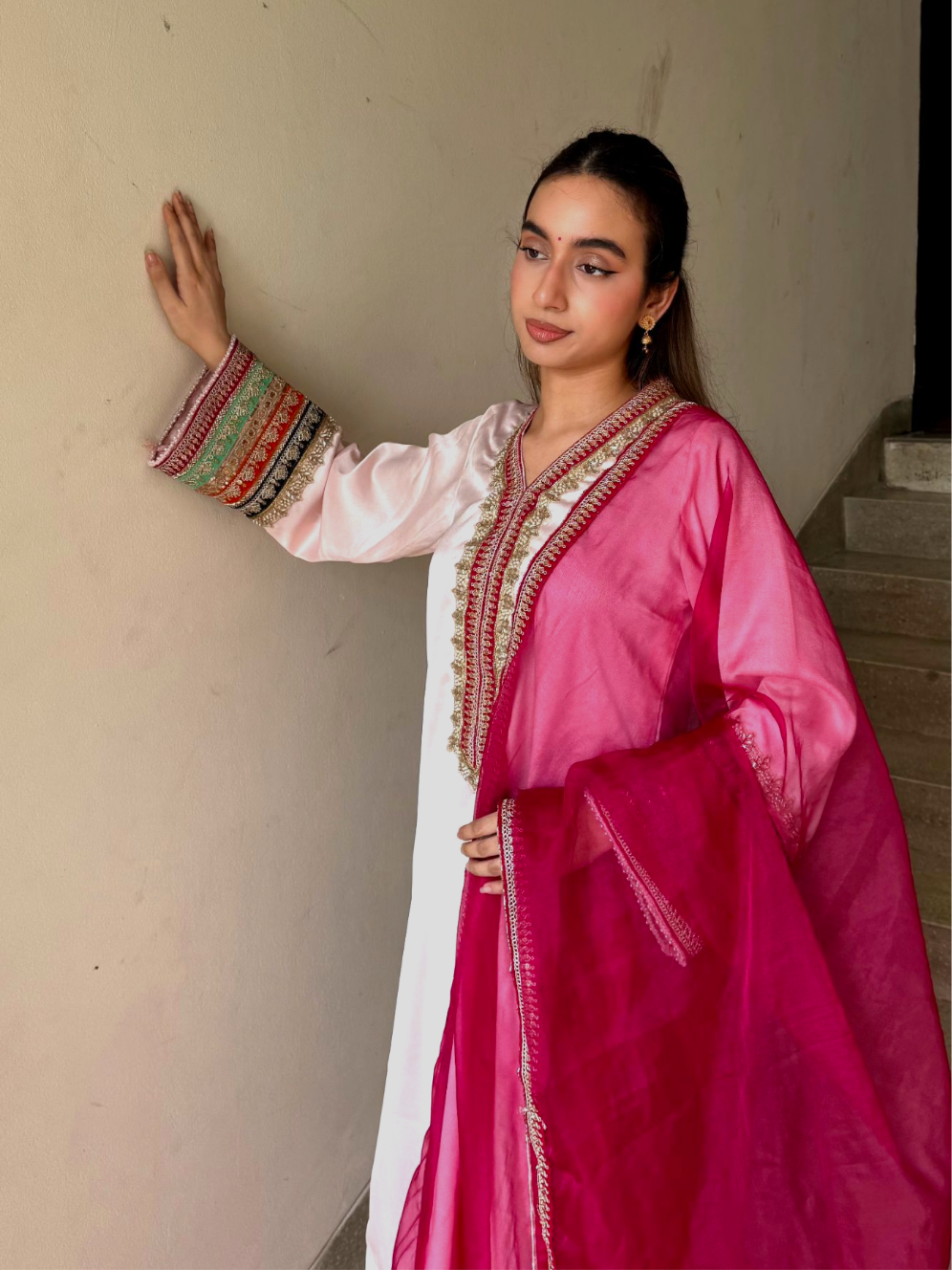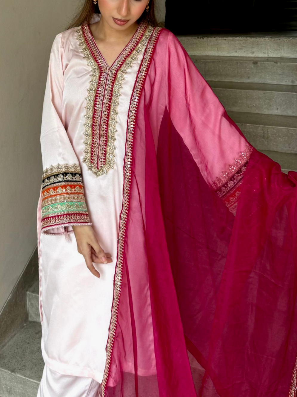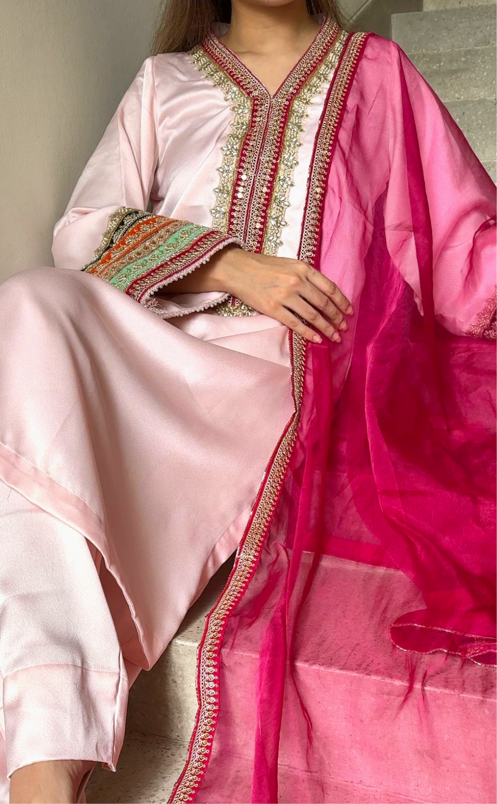 Made from soft pink premium silk detailed with delicate embroidery on the neckline and sleeves. Styled with loose-fitted pant and airy muslin dupatta, finished with matching embroidery