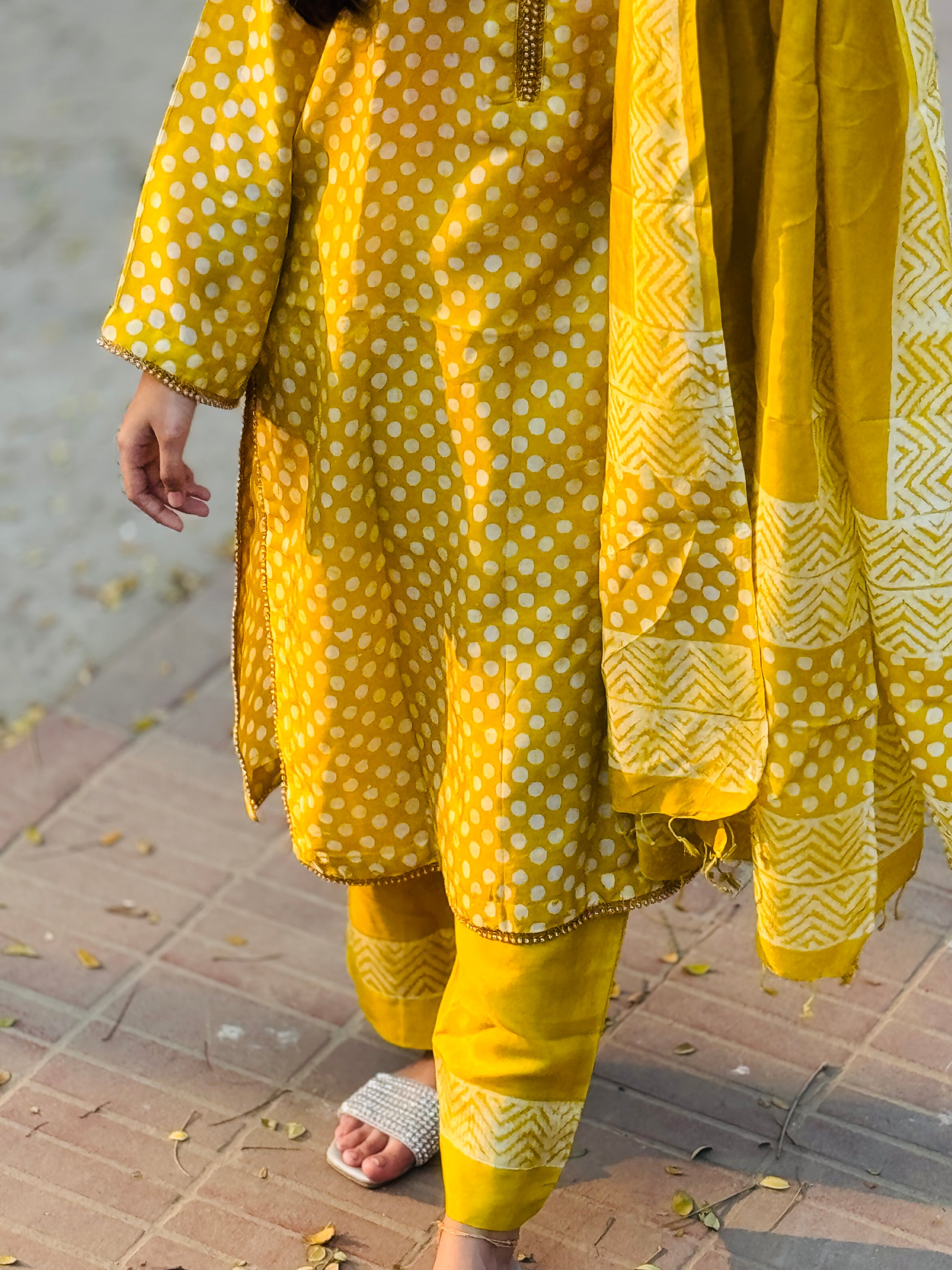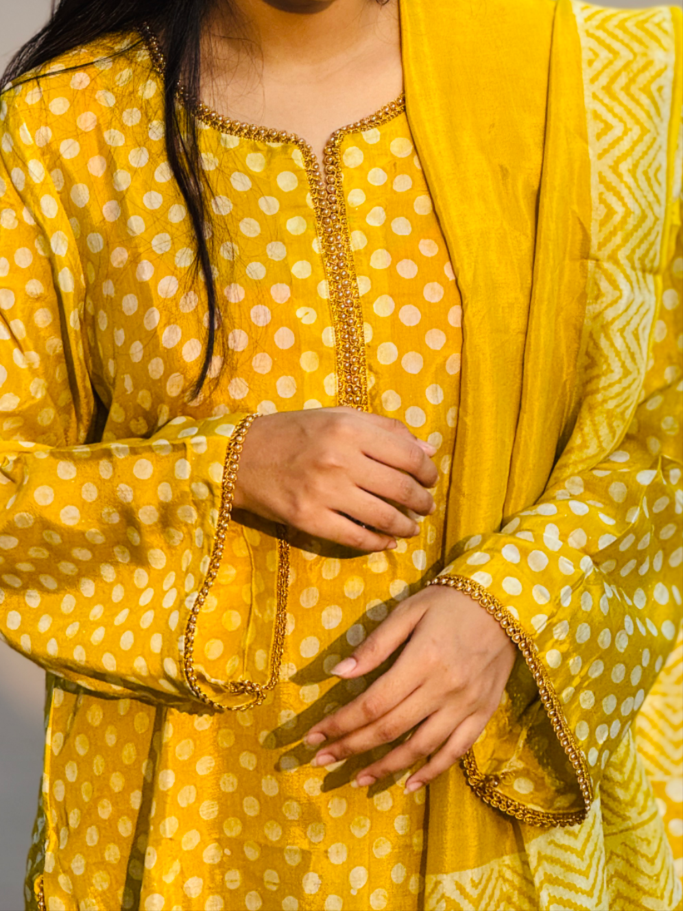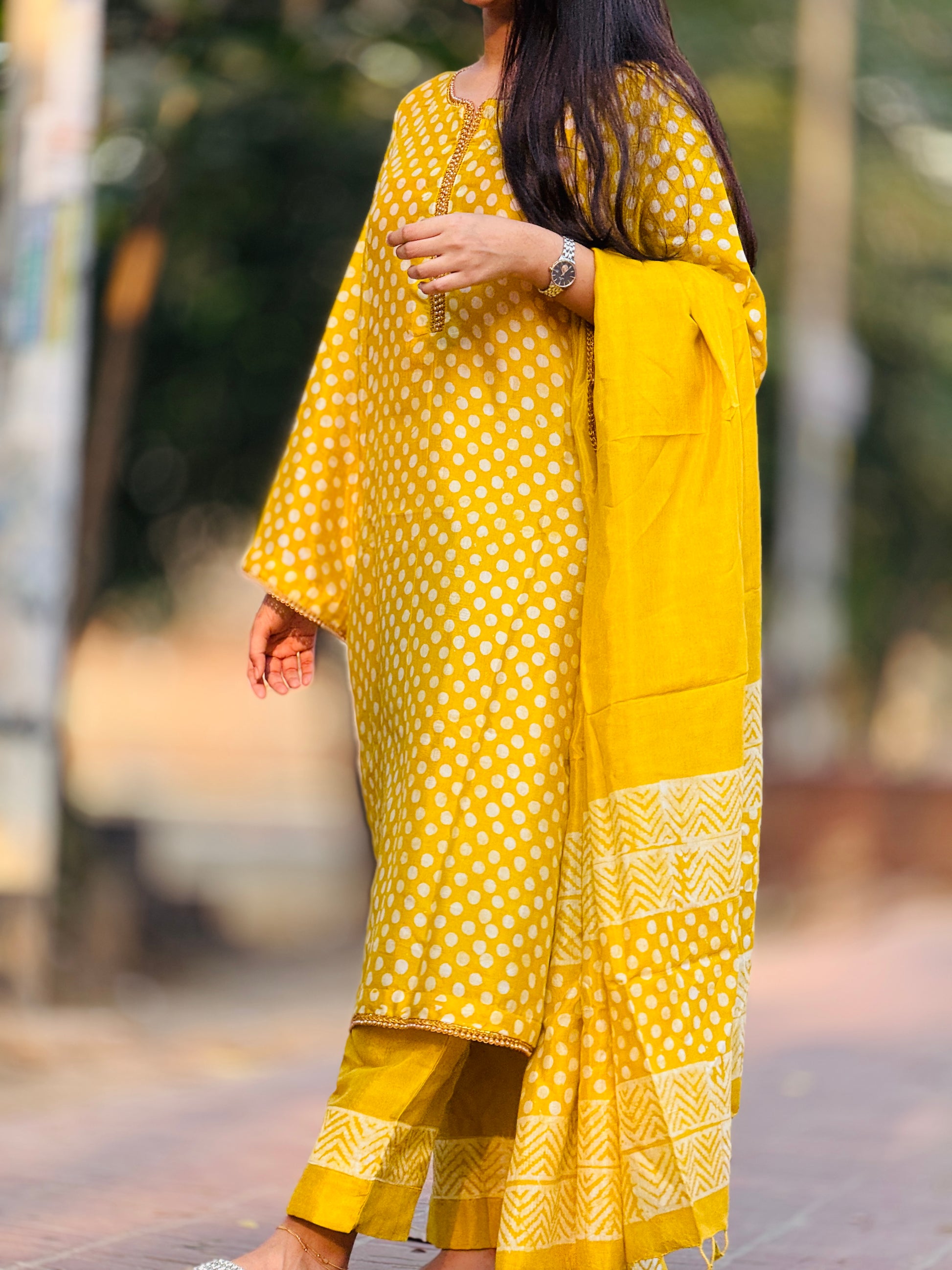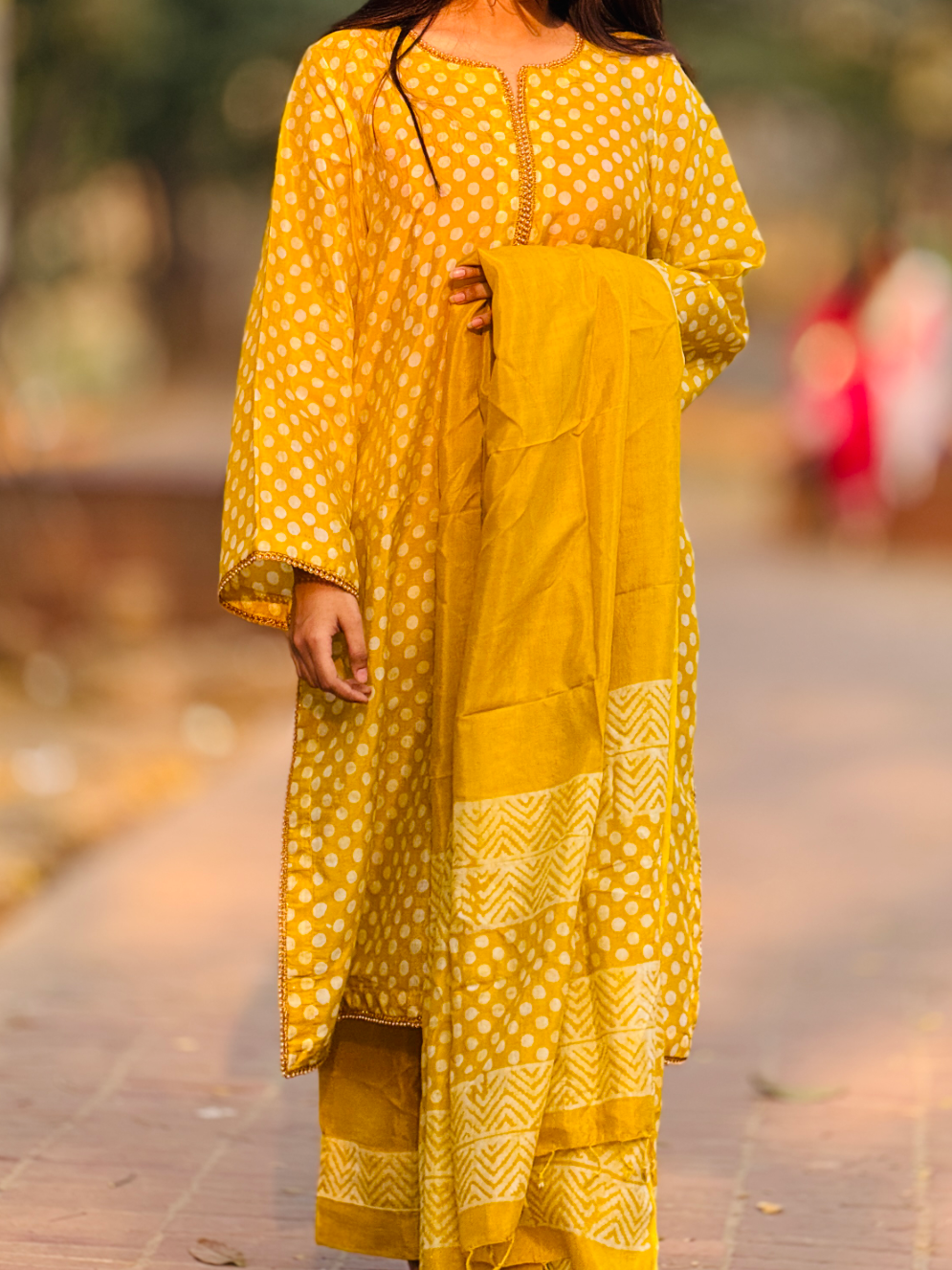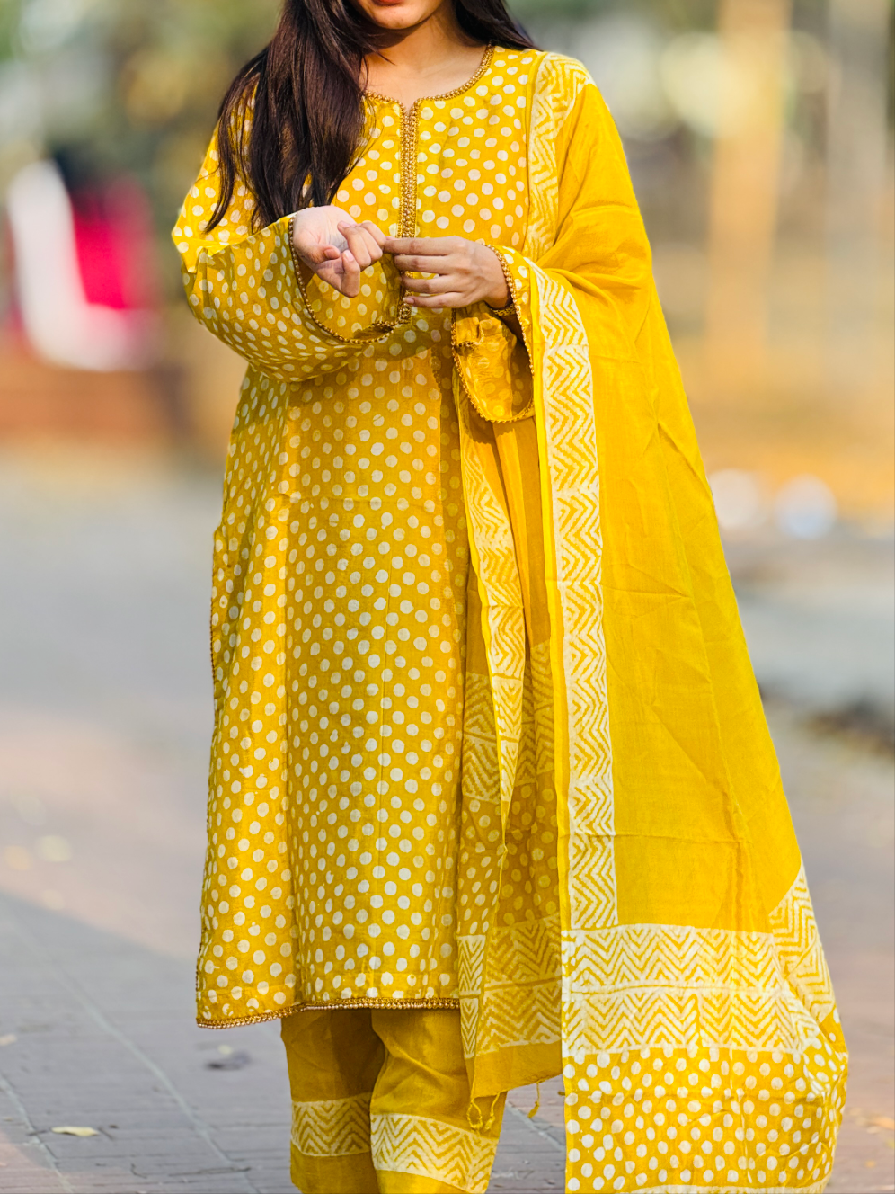 Limited edition: Cotton-silk salwar kameez with vibrant colors, breathable fabric and elegant lace work.