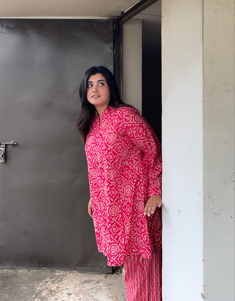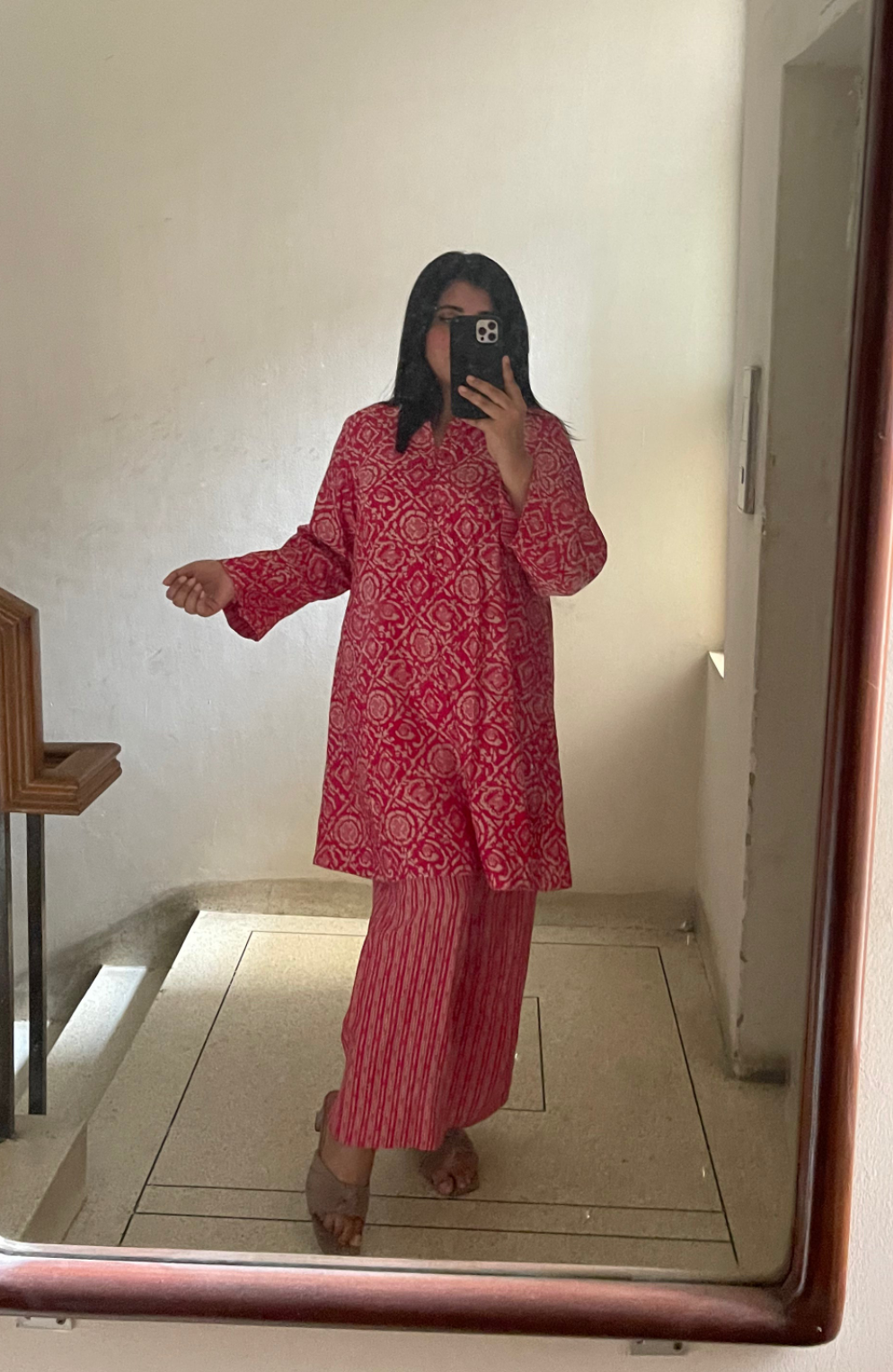 Premium summer friendly tie dye printed co-ord set with button detailing on neckline and straight cut loose fitted pant